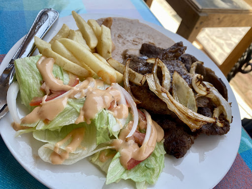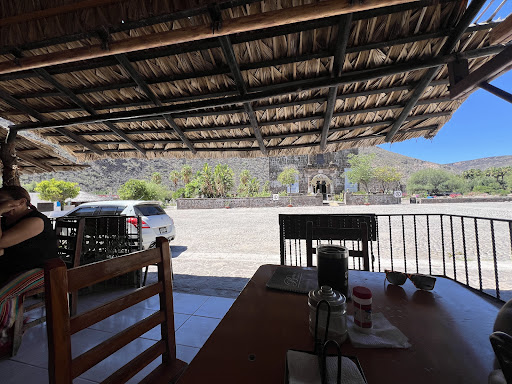 Service is great. View of the mission also great. The food is the star for sure. I had chicken enchiladas verde and my husband had Carne Asada. Both were delicious. The verde sauce is yummy, the verde salsa is HOT!, but good. My husband's was so tasty. It is a bit more than you pay in Loreto, but its so good you don't mind. We also bought a jar of the dulce leche that a few of the places there were selling,...