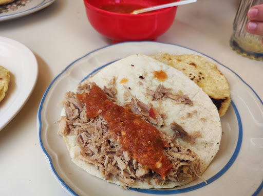 Food is local. Their speciality are "gorditas" which you can have with many different things inside like meat, nopal, potatoes, egg...They also make tacos, pozole, today's and other local dishes. Well located, good service,...