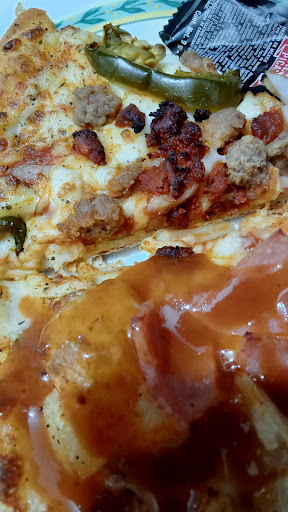 Mala atención desde el inicio, necesitaba servicio a domicilio y me dijeron que no tenían repartidores. Fui por la pizza al establecimiento y oh sorpresa: los repartidores si estaban trabajando, incluso unos estaban bromeando con personal de cocina. Me atiende la persona en mostrador de manera apresurada. Y al pedir dos pizzas grandes me da 5 sobres de salsas. Al pedirle más salsas me dice que ya no me puede dar más porque no se los permiten, a lo que le respondo "no me las regales, dame 20 sobres y dime cuanto es" me responde... "no las podemos vender y no nos dejan dar tantas salsas por pizza" le respondo... " cuántas personas crees que se van a comer dos pizzas grandes?? Dos personas?? Me da otras 5 salsas... Muchas gracias. Pésimo servicio. Y las pizzas regulares. NO sé quiénes sean los que regulan a los gerentes, pero jajajajaja qué pésima lógica y qué mala...