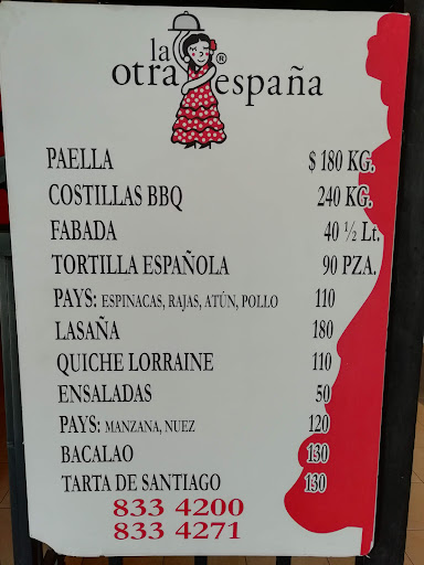 Read moreLa Otra España es una franquicia especializada en repostería y algunos guisos de comida española. Los alimentos ya se encuentran preparados, simplemente llegas y tomas lo que sea de tu agrado de las mesas antes de realizar el pago. Cuentan con tres ubicaciones en la ciudad: Amado Nervo, Avenida Himalaya y Centro Comercial el Dorado. Los postres me parecen lo mejor del lugar, particularmente el Pay de Nuez y la Tarta de Santiago. En lo que respecta a la comida me parece correcta en algunos casos, pero en lo que respecta a la paella si me parece que le falta bastante. Los precios no son económicos, por lo que al final solo los postres tienen una calidad acorde al costo. En resumen recomiendo la repostería pero me lo pensaría dos veces antes de volver a consumir otros...