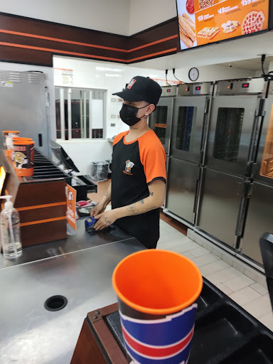 Primera y última vez que voy a este lugar, fui el día 26 de octubre a las 8 p.m. pedí 4 pizzas clásicas de peperoni y el cajero dijo No Hay ! solo hay x, y y z el horario es hasta las 10 y ya no había producto, pedí hablar con la encargada del turno y solicité el producto y dijo q tardaría una hora aprox , creo para no vender. Le dije que esperaría y así lo hice. Llevaba a mi nieto de 4 años y en lo que yo hacía mi pedido la señora que limpia le dijo con un grito" hay niño acabo de tapear quitate! A lo que yo le dije que si yo no le gritó a mi nieto ella menos debía de hacerlo. que pusiera el aviso de "no pasar" o." Piso mojado" porque si algo le pasa a alguien se pueden meter en problemas. . Motivos suficientes para que hagan algo al respecto los dueños. Yo soy clienta asidua de otras sucursales pero en esa ocasión las necesitaba porq estaba en una reunión cerca de ahí. Estoy a sus órdenes para...