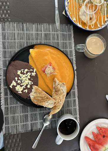 De comer de entrada pedimos café de olla súper deli en su punto y un croissant con mantequilla y mermelada el cual estaba muy suave y esponjosito. Ya de plato fuerte de desayuno yo pedí unos chilaquiles divorciados con salsa de chicharrón (la cual estaba deliciosa) y salsa Provolone (perfecta para quienes no gustan del picante), mi acompañante pidió unas gorgonas combinadas (el menú solo da opción de 3 de un mismo tipo) presentadas muy padre en un tipo mi asador pero lo que no esta padre es que si las pides combinadas te cobran las más caras más ingrediente extra de cada una, yo creo que deberían cobrar solo las más caras como en otros lugares o bien sugiero incluir en el menú una opción así combinada.