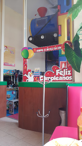 Me parece un lugar excelente para ir en familia. Los niños se pueden divertir tanto en los jueguitos como en los videojuegos que hay, ambos, en la parte de arriba. El espacio es amplio y hay muchas mesas. Me gusta que no apesta a pollo ya que donde los cocinan está apartado de las mesas. En cuanto a la comida puedo opinar de lo que he probado: el pollo me parece en un término perfecto, ni seco ni muy húmedo; el spaghetti está más o menos, me gusta más seco pero no está mal; las quesadillas son deliciosas, la mezcla de quesos creo queda perfecta y la masa es muy rica, de hecho me da la impresión que las tortillas son hechas a mano. También hay cerveza y refrescos. Un problema que si veo es que encontrar estacionamiento a veces es muy complicado. Hay que buscar en las calles aledañas o llegar temprano ya que también hay gente que se estaciona para comprar pollo para llevar. La atención de los empleados me ha parecido excelente hasta el momento. El lugar cuando vamos está relativamente limpio. Los baños también los he visto limpios siempre. Es un lugar que recomiendo ampliamente. Además mi recomendación es llegar temprano los miércoles ya que hay promoción de un pollo y medio a precio de uno y un refresco de 1.5 litros por $10 más (creo que sí son 10 pesos...