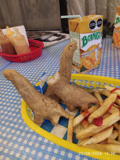 Vi la publicidad de este lugar y me llamó la atención, por eso decidí ir junto con mi madre. Para empezar; el lugar se ve un poco descuidado, pero lo pasamos por alto. Pedimos dos dinoquesadillas, unos boneless de mango habanero, y unas fajitas de pollo empanizado (no recuerdo el nombre de estas últimas). La masa de las dinoquesadillas no sabe nada bien y casi no tenían carne. No sé a qué se deba pero el color de estas es más oscuro del que se muestra en la publicidad (no eran de maíz azul). Los boneless estaban muy lejos de saber bien, a parte de que el pollo estaba súper seco la salsa de mango habanero sabía extraño, no comúnmente a lo que sabe el mango habanero. Con las fajitas; el mismo problema que los boneless, muy secas, pero en cuanto a sabor, si hubo una diferencia positiva. En conclusión no recomendaría este lugar y creo que deberían mejorar...
