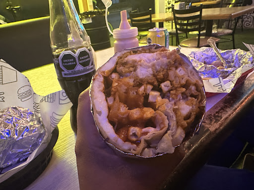 This spot is great for an evening snack I ordered the baked potatoe with meat and it came with chips as they accustom here in Mexico. The spot itself is cool as it was neon lights decor and the wall full of cut figure cartoons the chicken boneless bites a yummy and fresh with several varieties. The off the street parking is easy and accessible. You can pay cash or card and the...
