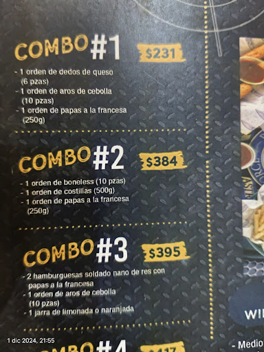 Además de alitas y boneless también venden dedos de queso, aros de cebolla, hamburguesas, papas