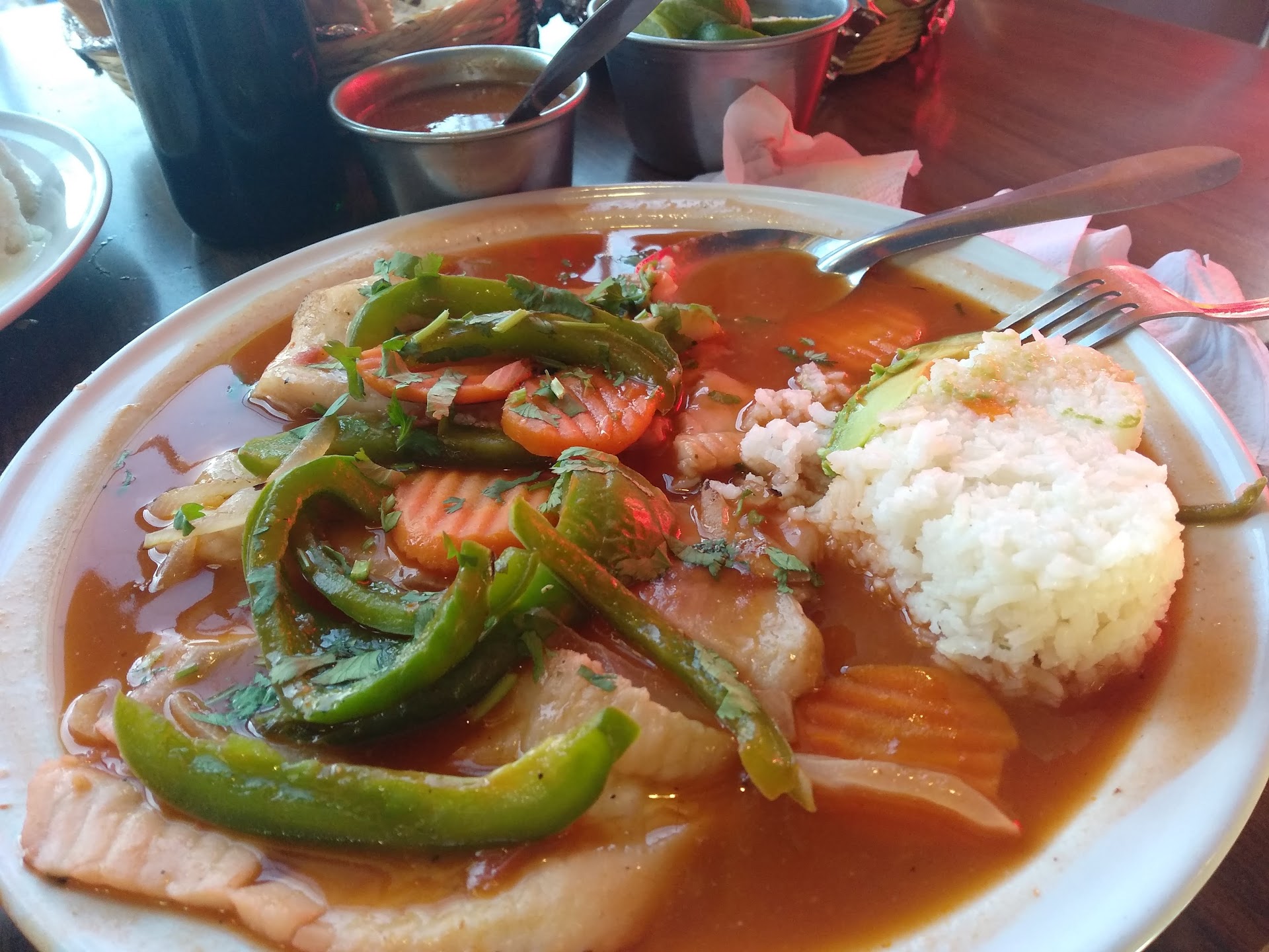 Excelente servicio, al solicitar el platillo,sirven de cortesía un caldo de camarón con apio delicioso! Mientras te lo terminas llega tu platillo, los precios van desde los filetes al mojo de ajo, o a la veracruzana,o a la crema de nuez o a la mexicana, etcétera por $110, hasta el salmón y bacalao por $250 el kg de platillo, también sirven mariscos y ostiones,pulpo y jaibas; las bebidas están desde $20 el refresco hasta $80 la jarra de agua. Venden cerveza,rusa de refresco,agua de fruta,jugos. En la calle lateral hay estacionamiento sin costo para comensales, el servicio es atento y rápido,los meseros atienden muy bien,sirven todo muy limpio y con muy buen sazón.Aceptan tarjetas,hay 2 pisos,no hay rampa para personas con discapacidad pero es accesible el lugar con ayuda. Super recomendado!!! En las fotos: Filete de pescado a la veracruzana (rojo)/ Filete a la crema de...