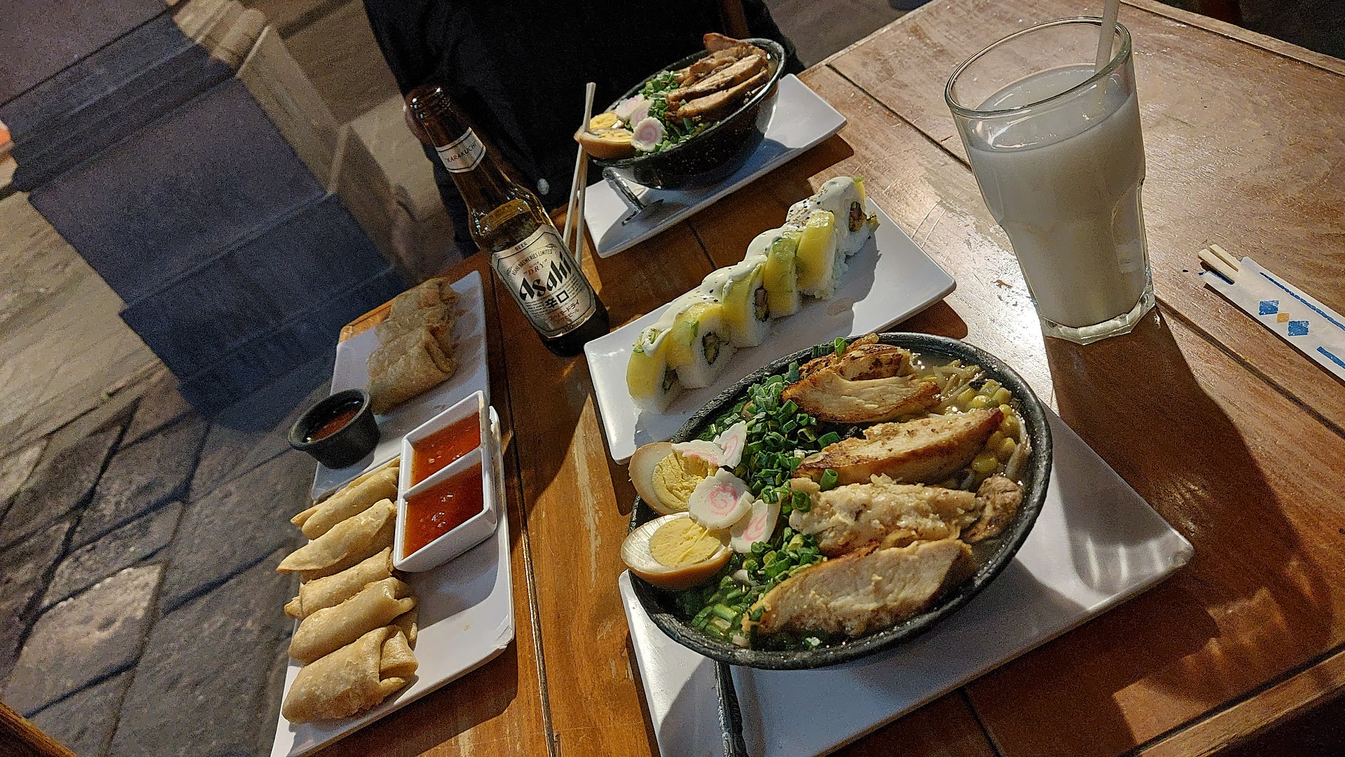 Yo tuve una pésima experiencia, desde que llegamos tardaron 20 min en tomarnos la orden, después 40 min para las bebidas y otros 30 min después para la comida, o sea desde que llegamos, hasta que pudimos comer pasó UNA HORA Y MEDIA, cabe recalcar que fui un miércoles, a las 7:30 de la noche, no era día de promoción, literal solo había 6 mesas en todo el establecimiento, es ilógico que teniendo 6 mesas se tarden tanto en llevarnos lo que ven en la foto El chico que nos atendió ni siquiera estaba al pendiente, estábamos sentados afuera y cada que salía le teníamos que gritar porque no volteaba, lo que si noté es que era el único mesero que había, pero yo también soy mesera y es una m4m4d4 que teniendo solo 6 mesas les des un servicio tan deplorable y les diré por que; teníamos que pararnos para pedirle cosas, no nos dio Servilletas, ni salsas, le pedí que le quitara el hielo a mi bebida porque estoy enferma y tardo 20 minutos en traerla de vuelta, cuando le ordenamos le pedimos un extra para el ramen, pedimos spring rolls y el nos llevó 2 ordenes, pero bueno, ahí también fue nuestro error porque al ver que nos llevó tantos rollos (cuando solo debieron haber sido 2) le hubiéramos preguntado que si estaba bien, pero bueno, se nos fue la onda con eso, también pedimos unas verduras capeadas que tampoco nos llevó... y bueno, cabe recalcar que gracias a los malditos spring rolls la cuenta fue de casi $900 :/ cuando nos hubiera salido en $600 Y otra cosa, era muy irritante el hecho de que los vendedores ambulantes no nos dejaban comer agusto :/ pero bueno, eso no es culpa del establecimiento, pero si van a sentarse afuera tenganlo en cuenta... La verdad el servicio está del asco, pero la comida si es muy buena, ojalá puedan mejorar en la atención...