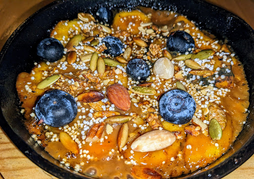 The food menu looked amazing and we had such a nice time so we came back the following night for dinner and wow- everything was amazing. This is 5 star authentic but modern Mexican food, beautifully presented. We had the corn soup w hutilacoche and the pozolito to start, both were light and full of flavor. The beef barbacoa sopes were wonderful. Our favorite was a pork tenderloin with plantains in a white mole, which we'd never had before. It was creamy and very slightly sweet and nutty, absolutely delicious. For dessert we had caramelized bananas with dulce de leche, blueberries, nuts, pepitas and sesame seeds that came out bubbling in a cast iron skillet and it was excellent.