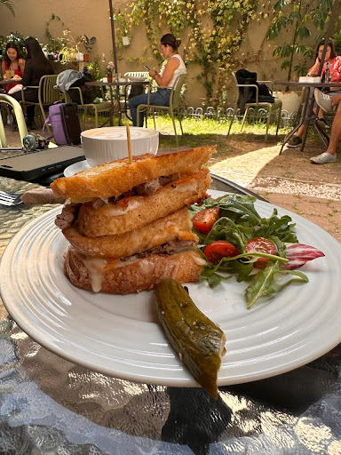 We went this morning for breakfast, a first time for me and return trip for my spouse. This place is absolutely charming, with a gorgeous courtyard but also options "to-go". They have a generous menu and can accommodate all kinds of dietary needs. From the beverages....a Caoco Coffee for me and Limonadad con Frutas Rojo for him...to the Yogurt-Fruit Bowl we shared..to the main appetizers...I have the French Toast with Poached Pear and he had the Cheese Sandwich (which also had Steak!)...everything was delicious!! The staff were gracious and helpful, our waiter also brought a fresh treat for our dog! This place is extremely dog friendly, your furry family members will be spoiled too! We also took home a loaf of sliced sour dough that was still warm, an added bonus. With so many wonderful places to have coffee and fresh bread, this is a great find and worth the hike up to...