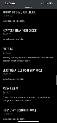 Read moreTo be perfectly honest Bajau was lackluster. The first time we went a year a ago it was “ok” but coming back to the island I believe this place has not done well to maintain quality. We went in with 5 people and the atmosphere itself is extraordinary. Feels highclass and it’s absolutely gorgeous. The service is absolutely fine as well. We have no complaints about that at all. I order the mojito and honestly is was delicious. Well made and mixed. I don’t recommend the mule cocktail, it’s a little tart, and their coconut cocktail was also syrupy tasting which I wouldn’t recommend. The reason I am scoring them at 2 stars is just plainly the food. I will however say the pork belly appetizer is incredibly delicious and cooked perfectly. That particular dish I would highly recommend. My wife ordered the steak hamburger and I should have went with that, perfect presentation and mix of flavors of cheese, sauce, and steak. What was unacceptably horrible was their flagship dish, the Tomahawk Steak. For a $2500mx dish you’d expect much more. I don’t need it to come out on a carousel, the presentation I wasn’t crazy about, but my attention is on the flavor and texture. It is also advertised as 2 1/2 lbs of meat, it wasn’t. It was tough, slightly dry, and void of flavor aside from maybe some of the fat. For a roughly $140 USD steak, I was unimpressed and very much annoyed. I was also not happy about the up charge on the fries that supposedly are drizzled in truffle oil and seasoned in cheese. The price for those fries are more than double than a regular order of fries, all for a very small sprinkle of Parmesan cheese over the top. Don’t believe me? Order fries and the fries in “truffle oil”