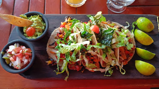 The tacos came with onions, red bell pepper, carrots, mushrooms and fresh romaine salad on top. It was served with guacamole, pico de gallo and homemade green salsa. It was very delicious, though the green salsa wasn't spicy at all. I'll rate the meal 5⭐ it was beautiful presented, came with guacamole and pico de gallo, and tased great.