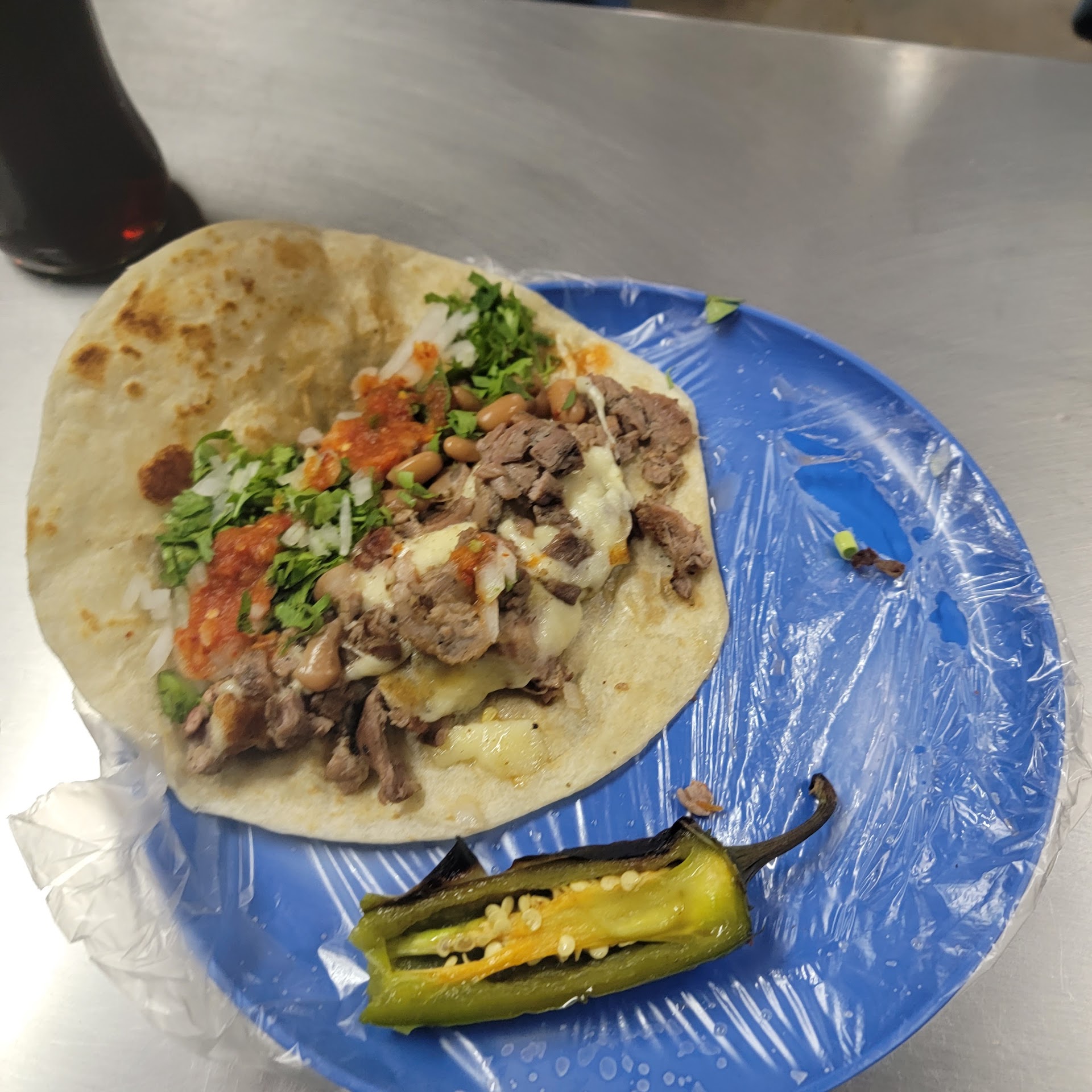 After you order, the order taker gives you a slip of paper with your order, which you hand to one of the preparers. They grill and assemble your order, and hand you your plate. They have a crock of beans and grilled jalapenos and onions nearby. Some patrons add the beans to their tacos.