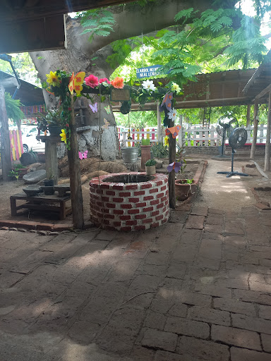 En el área de la entrada, las mesas tienen pintados edificios o personajes emblemáticos de Sinaloa, voltea a verlas todas. En los maderos de la palapa están pintadas figuras que simulan las formas que se labraban en las piedras de la zona costera en épocas prehispánicas.