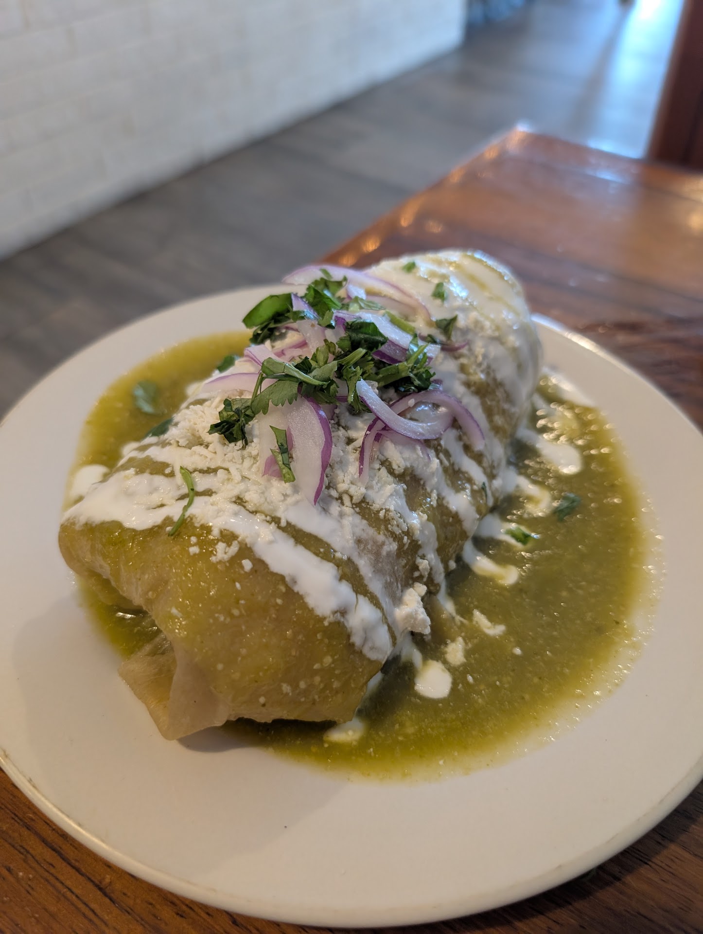 The server recommended the strawberry mango smoothie, which I enjoyed. I read a lot of reviews about the chilaquiles burrito, so I tried it with chicken and verde sauce. The chips and the tortilla felt like a lot of carbs and the chips were soggy in the burrito so next time I will stick with just the normal chilaquiles. The green sauce was amazing. Tangy and flavorful!