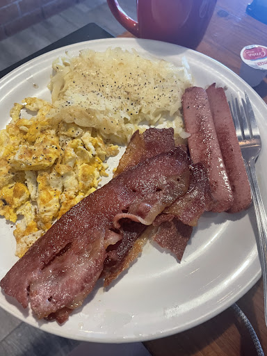 Read moreQuaint Indoor and outdoor dining. WiFi available but seating not very comfortable for work unless you get a booth. Must cater to English speakers because of the music and servers with a preference to speak English to foreigners. Coffee is best on the block so far. Bagels are ok! Like the bacon and the fact that I can order off the Sides. Would not get the hash again since it was under cooked and soggy as shown. Scrambled eggs overcooked. Breakfast sausages are hotdogs as shown. Service is quick and servers are nice but you do have to be direct and ask for everything you may need, I.e, creamer, fork etc.. of course I’m sure if depends on the server. Service outdoors...