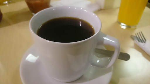 Primero nos llega el café junto con el jugo, este último estaba bastante bueno y fresco mas no helado. El café era negro, dándote la azúcar normal en sobre, la crema y el sustituto de azúcar para los que prefieran de esta opción. El cuerpo del café era normal, se sentía que era algo más espeso que si fuera pura agua, pero sin tan espeso como un jugo de naranja. El aroma es agradable, un poco agrio y acido (previo a ponerle azúcar y crema), yo no soy ningún bebedor de café profesional, pero me agradó la temperatura, era la perfecta para mí, estaba caliente para poder disolver el azúcar y crema, pero no tanto como para esperar a que se enfrié o tener que soplarle.