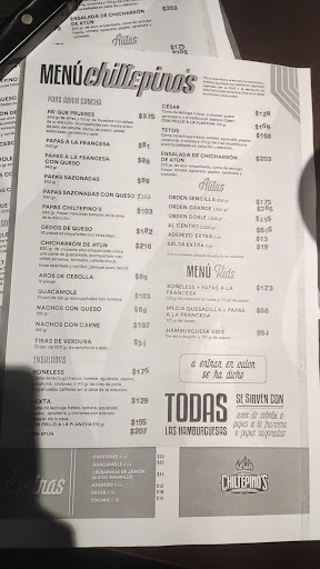 Read moreWe've seen mixed reviews of Chiltepinos. Our experience was a good one. Lots of menu options. Salads, sandwiches, burgers, etc. Wings and fries we had were yummy plus the giant, cold, draft beers were only 79 pesos. Our server was attentive and kind. Lots of TVs playing sports and music videos. Not too busy....