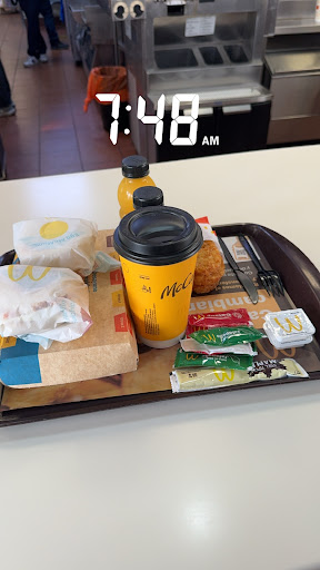 Ordenamos a las ~7:15. Desafortunadamente, las nieves no estaban disponibles, cual se me hizo raro porque apenas empezó el día. Ordenamos algo simple para tres personas porque llevábamos prisa. Eramos los únicos adentro, no había otra gente ni adentro ni por el Drive-Thru. Nosotros teníamos prisa y estuvimos esperando pacientemente al principio. Me acerque para ver si ya mero estaba la comido y es cuando me di cuenta que solo una persona estaba cocinando. Una chica solo estaba parada como estatua mirandolo, otra chica hablando por teléfono y el otro chico limpiando la cocina. La mujer que nos tomo la orden, saco primero las bebidas pero no nos dio, ella dejó que el café se enfriara y los jugos se calentaran. Las bebidas estuvieron afuera como 20 minutos hasta que la comida estaba lista para dar todo junto.