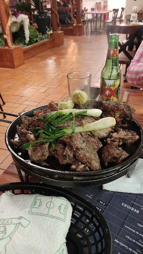 The steak is served on a hot iron skillet and you can get various combinations of steak and ribs (costillas). It is accompanied with grilled onions. Upon request, grilled Serrano chiles are served as well (hot hot hot and rico!). The veggies (lettuce, tomato slices, green chile, and radish) are served separately as are the beans. Along with that, massive tortillas - thin, uber fresh, and delicious are provided.