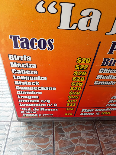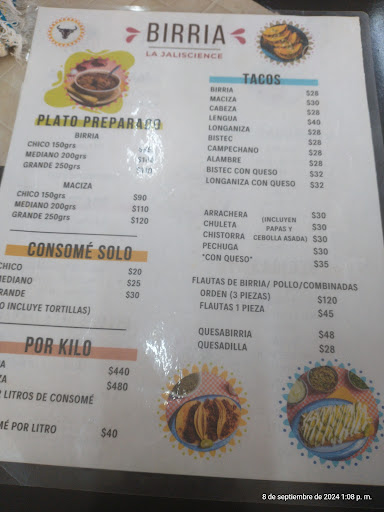 La birria está muy rica y los precios son bastante justos. Cuándo compras para llevar el más grande es en un recipiente de un litro y le ponen bastante caldo y también carne. Por taco también está bien despachado. La salsa roja le va muy bien a los tacos. A demás tienen en su menú otras opciones aparte de la birria y el agua de horchata es muy rica. Cuándo no hay lugar para estacionarse en frente a la vuelta puedes hacerlo en un espacio que ellos destinaron. El lugar es muy limpio y el personal atento. Es una excelente...