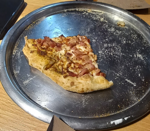 Apenas me dan mi pizza, nos sentamos a comerla. La vamos abriendo y nos corren puesto que según ellos ya tenían que cerrar. Yo le comente lo que paso a la chica encarganda e igual no le importo y nos corrió del lugar. Hablando del lugar es muy sucio. Los baños están repletos de basura y no los limpian y dejan qué los perro callejeros entren al citio y estén de encimosos con la gente.
