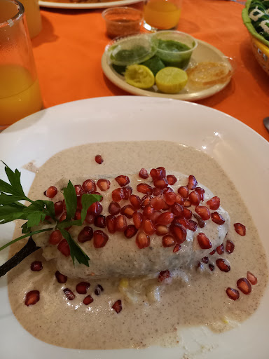 Cominos el chile en nogada, una joya del lugar. Agua de mango, postre de temporada, consome de pollo y códito de 3 quesos.