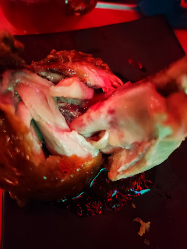 Pedimos todos piernitas al mismo tiempo y yo le pegue una mordida grande, el pollo tenía textura diferente pero creí que por la cocción especial que llevan sería normal , mi novia me dijo que el hueso se veía sangre pero por la luz roja creímos que era ilusión óptica, usamos el flash del celular y nos dimos cuenta que la cocción no llego hasta adentro y al centro el pollo aún estaba crudo, abrimos las demás piernas y todas estaban igual, no nos gusta desperdiciar comida pero las tuvimos que regresar por miedo a salmonelosis por el pollo crudo.