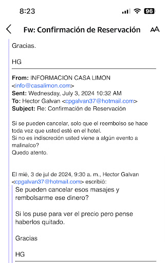 Aside from that, they owe us a refund for massages we never got. Initially, I made a hotel reservation to include massages. However, I immediately called and requested the cancellation of those massages. They said they would not be an issue and that they would refund us when we were there. That never happened. Here we are four months later and we still don’t have a refund. Their manager, Raul agreed to refund us but has come up with one excuse after another such as their PayPal account not working.