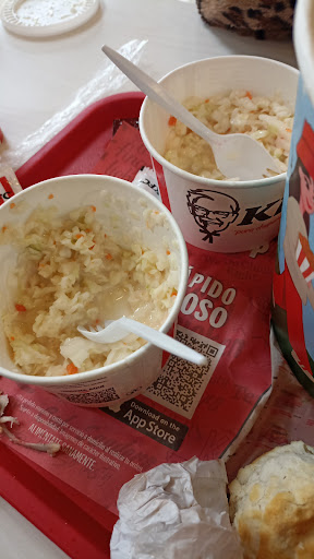 Un tache enorme se lo lleva el chico que supongo que es el gerente, ya que también estaba vestido diferente (negro) y afuera de la cocina, motivo por el cual no doy las 5 estrellas. TODO EL TIEMPO SE LA PASÓ EN SU CELULAR. Eso da una pésima imagen, debería estar al pendiente de todo, ayudando a la limpieza, ayudando a las personas con las pantallas, dando las buenas tardes-noches, etc. Incluso antes de que me entregaran mi pedido, llegó una amiga de él, se sentó en una mesa a platicar y siguió en su celular. Mientras tanto, un cocinero tomaba con sus manos unas papas y se las comía, directamente de donde sirven las papas para los clientes. Se que en el restaurante hay cámaras y también los protocolos que tiene una empresa como KFC, por ello estoy sorprendida que un gerente no cuide su lugar de trabajo ni esté al pendiente de que las mesas estén limpias, de su equipo ni de que ya no tienen contenedores para entregar puré familiar y te lo den en vasos...