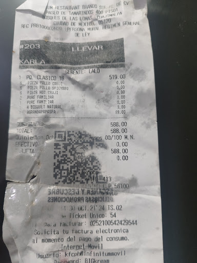 Read moreAyer por la noche mi familia y yo fuimos a comprar en el autoservicio un paquete familiar de 18 piezas estilo crunch sin picante. Tomaron nuestra orden y nos mencionaron que tardarían unos 25 min. en darnos nuestro pedido. En frente de nosotros había un carro y una moto, de los cuales más adelante nos enteramos que ya llevaban más de una hora esperando su pedido, pasando 40 minutos nos vajamos a ver porque tardaba tanto en atendernos, el manager del local nos comento que en la noche solamente iban sacando pollo con forma iban pidiendo, adentro del local había mucha gente y para ese momento éramos 4 carros y tres motos esperando en el autoservicio. Adentro en las cocinas el personal ya se encontraba limpiando todo y solo estaban sacando de una charola a la vez. Pésimo servicio. No es la primera vez que vamos a un KFC en la noche, esta es la primera vez que nos pasa esto. Al final nos dieron un paquete de 12 piezas y nos cambiaron un Bisquet por papás porque dijeron que ya no tenían más. Al llegar a casa y estar cenando el pollo, este estaba frío y masudo, sin su característico sabor crocante, espero que cambien...