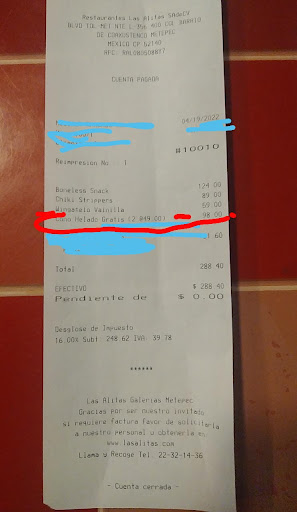 Read morePésimo servicio, estuvimos una hora esperando los alimentos y nunca llegaron. También toca capacitar a sus empleados, explicó : pedí un come todo (el cual funciona como un buffet , en el cual tú puedes pedir boneless ,alitas, ensalada y papas , topado a 2 horas …) , la mesera asiente, y procede a decirme que si voy a pedir otra cosa, le digo que no , que solo quiero unas alitas para empezar (del come todo) y ella me comenta si me las trae aparte del come todo … ¿?¿? No tienen ni idea de sus promociones, ni de tomar una orden, se les haría coherente pedir un come todo que incluye alitas y aparte unas alitas a precio de carta ? Se va diciendo que vienen nuestros alimentos… Después nos tuvo que mandar a otro mesero que llegó 15 minutos más tarde, porque claramente no hizo nada!