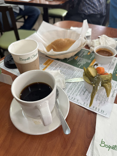 La atención sin duda es amable,los anfitriones y la mesera muy amables, desde el comienzo,la carta se me hizo cara e ido a otros restaurantes más caros y los precios son mucho menores en variedad de platos,la sopa al estilo bisquets muy sencilla parecía cuando hierven pollo en agua y huevo le faltó sabor,los burritos parecen sincronizadas, empanizado al estilo bisquets $155 se mi hizo muy poco la cantidad y calidad por el precio,la sopa azteca sabía mejor y el costo es menor, las enchiladas de pollo gratinadas, muy buenas y suaves,el agua de frutas muy fresca, los capuchinos muy buenos, los bisquets se supone que es lo fuerte de esas cadenas,me tocó duró!!!!cuando vas en busca de bisquets tienen que ser suaves, que cuando los comas hagan el complemento con el café.