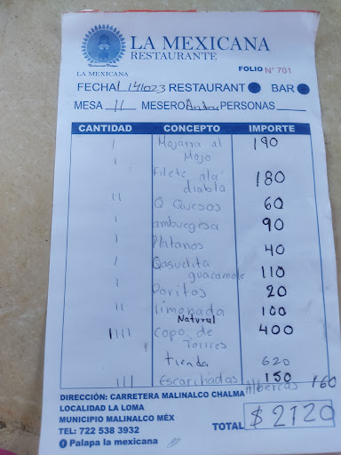 Read moreMalinalco, que puedo decir, personalmente está horrible el lugar, en segundo este sitio la palapa mexicana, tiene un servicio lento demaciado lento pese a que no tiene mucha entrada, y cuando llega la comida en verdad lamente haber esperado, no es un lugar caro, las instalaciones están bonitas y amigable. Pero a lo que se va realmente no vale la...