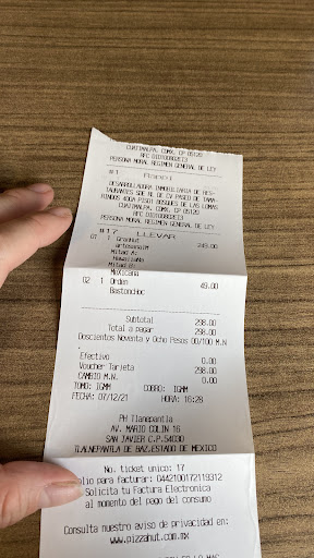 Read moreMuy buena atención y rápido. Cada ves me sorprende más con lo amables que son y la gran atención. Esta ves decidimos comer ahí mismo y cambia totalmente la experiencia. Desde que acaba de salir y está en gran temperatura. Recomiendo más comer ahí mismo y verán que sera otra experiencia. Esta ves tocó la de mitad y mitad para probar la mexicana, con la tradicional hawaiana y vaya sorpresa con los jalapeños y el tocino de la mexicana. Ya para terminar y de postre los bastones de choco avellana fueron deliciosos. Gran sabor del relleno. Definitivamente regresaré y probar las demás...