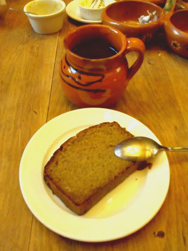 Después de toda una gran experiencia, y además de que tuvieron mucha paciencia para esperar a que disfrutáramos de nuestros alimentos, nos obsequiaron por cortesía de la casa este delicioso panque de plátano, y conchita para acompañar con cafesito de olla. Un deleite de verdad.