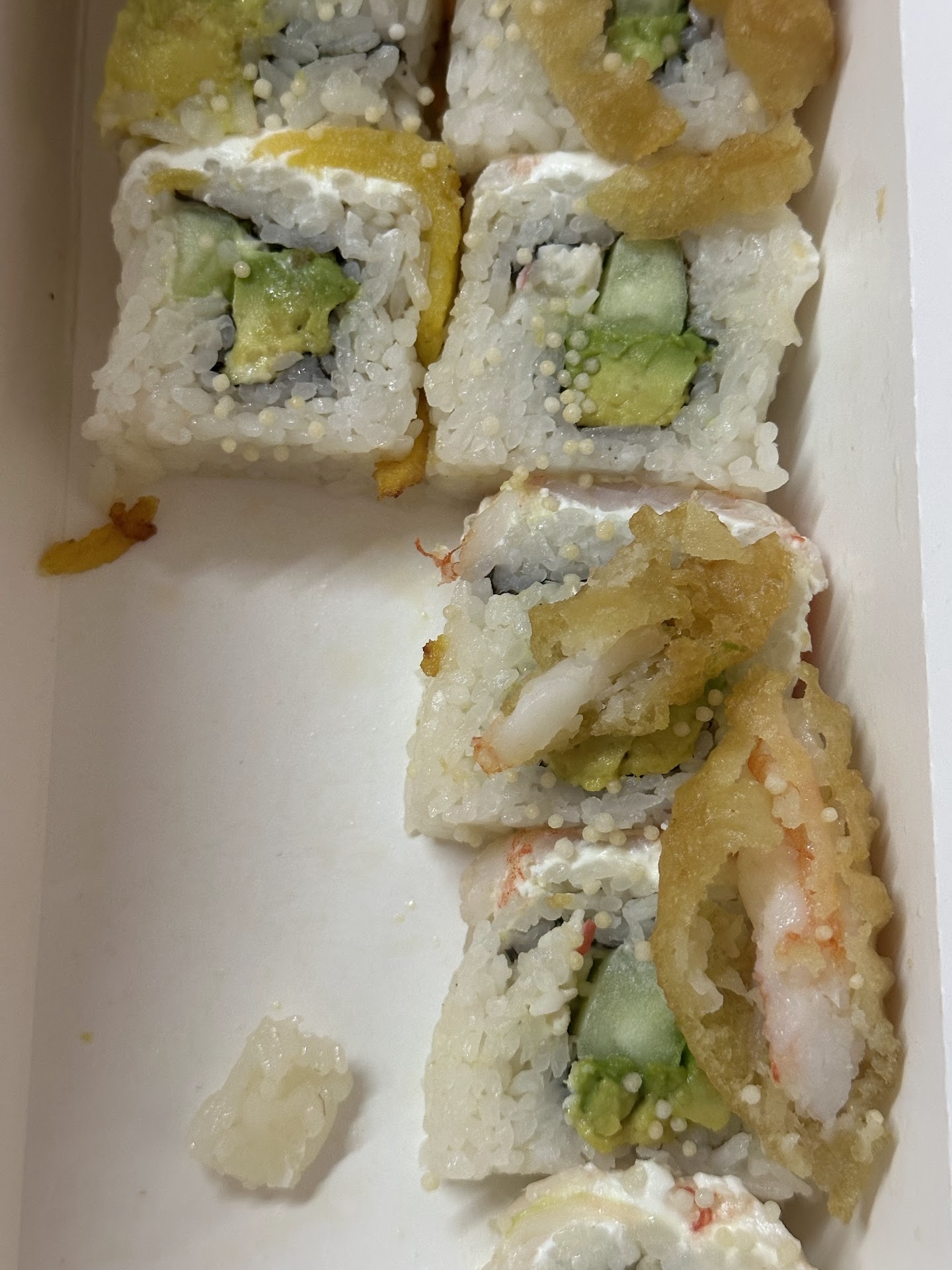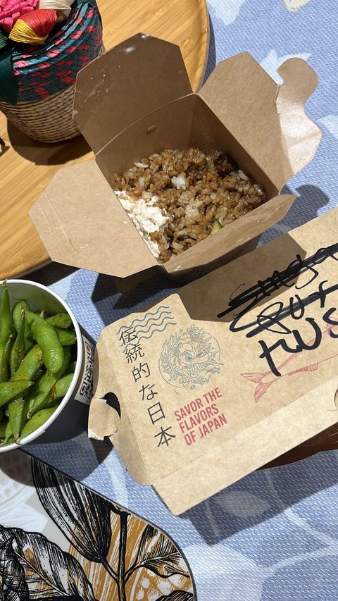 Así llego nuestro pedido Yakimeshi con Tampico (frío y sin cuidar su presentación), el Kishiage queso con la caja toda rallada que se ve que era de otro pedido (llegaron fríos) y el edamame leom pepper...