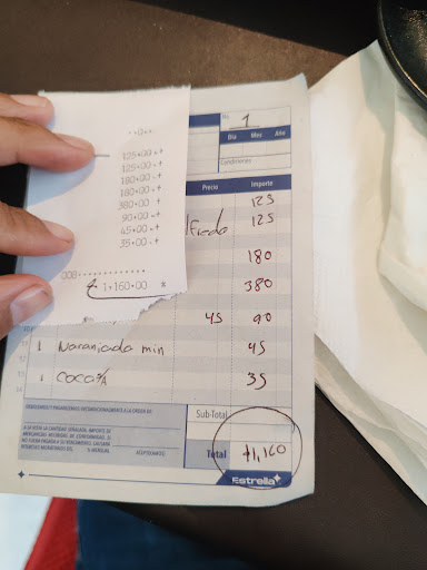 El día 8/mzo/25, tuve una serie de eventos desafortunados en mi visita, aclaro que no es la primera vez que acudimos a comer aquí. Por principio de cuentas la información del lugar dice que tienen servicio a partir de las 1:30 pm,lo cual es falso , ya que a las 1:50 me comentan que va a tardar el servicio por qué aún no encienden sus estufas (me sirvieron hasta las 2:40 PM). Al ordenar pedí la especialidad de la casa (T-bone, lo cual debí meditar un poco más , pero al ser la especialidad decidí pedirlo ) La sorpresa fue al recibir un pedazo de carne mal cocinada , chamuscada y con bastante nervio, lo cual sugiere que no cuentan con los insumos ni el personal adecuado para cocinar lo que ofrecen. El colmo fue al pedir la cuenta ,me estaban cobrando de más (no es la primera vez) Eso sí tuvieron bastante esmerados en que pareciera normal , pero tanto en la suma de la nota y en el ticket que dan ,estaban mal sus sumas (perdón , pero dos veces la misma equivocacion ?) Para resumir , la comida es regular, Pero su corte, t-bone si es lo suficientemente malo para jamás volver a pedirlo Su servicio deficiente Pero lo que más les recomiendo es revisar sus cuentas (está es la tercera vez que me sucede y leyendo comentarios, no...