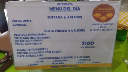 Es una opción de primera. (Mi experiencia) Llegas y hay un pizarrón que te ofrece la comida del día que incluye: Sopa o crema. Plato fuerte a elegir. Postre. Agua de frutas refil. Costo: $100 pesos. Tienen opciones 0ara pedir por tacos según sea el guiso de cazuela que elijas. (tienen variedad). El mesero muy atento, pendiente, fue rápido, nos dieron agua, y la comida, estaba bien cocinada con excelente porción aunque para mí con un poco menos de sal estaría bien aunque eso puede ser gusto personal, cuenta con aire acondicionado y sanitarios, no así con estacionamiento. En general buena experiencia. Aunque no estoy enterada del precio de las cazuelas y o eventos tengo entendido que tienen disponibles mesas calientes que ofrecen para fiestas y demás. Parece que el personal está sensibilizado a la...