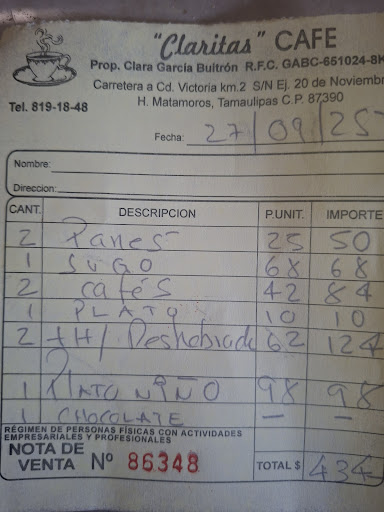 Read moreEstán deliciosas las tortillas de harina y los almuerzos se sienten muy caseros en café clarita's. Solemos venir a almorzar a este lugar cuando venimos a darle servicio al auto en la agencia de Toyota qué está al lado. Aunque aveces hay fila para entrar, vale la pena esperar un poco para tener tu mesa. El lugar tiene una decoración variada entre elementos mexicanos y estadounidenses. Recomiendo pedir tortillas de harina sobre...