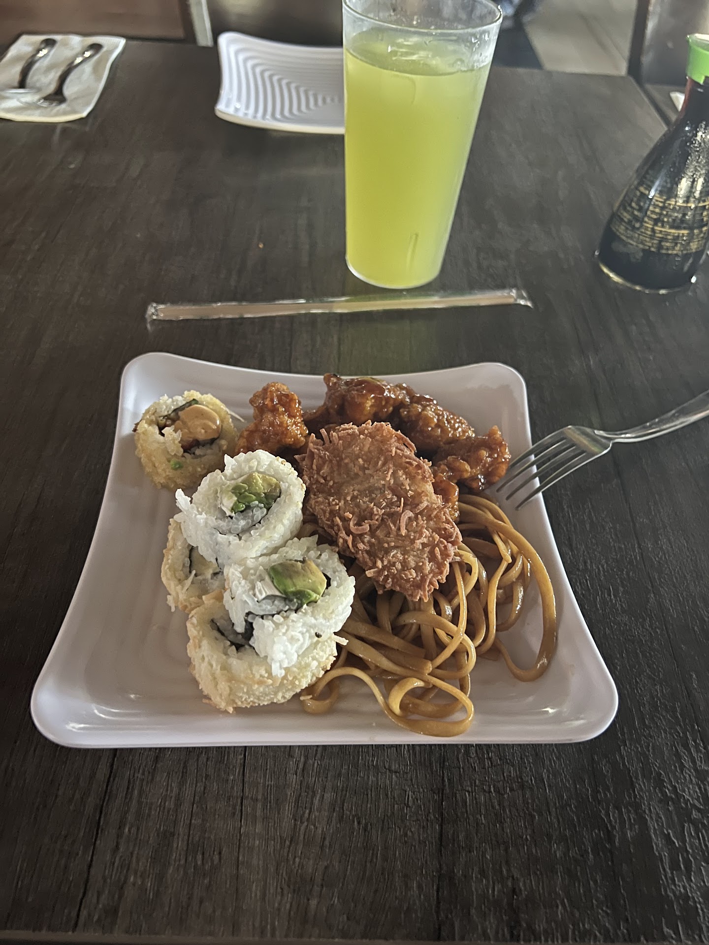 Read moreBien solo estuvimos un poco esperando había mucha gente, el mesero fue muy atento a cada momento nos ofrecía agua refil. Los sushis fritos son lo mejor, los postres deliciosos tienen mucha variedad de sushis,diría que demasiados,como 6 postres a elegir mi favorito fue el buñuelo el pudín la ensalada de frutas y la bolita que es como pan de dona con chocolate. De los guisos me encantó el res con salsa de ostión,los fideos chinos el pollo agridulce y el pollo con verduras y chile. La verdad faltan muchos más de res. Ese fue el único. Hay mucho pollo en diferentes cosas no vi platillos de cerdo y mucho menos hay mariscos solo en los sushis salmón camarón y surimi pero ni se sienten. Hay ramen pero sentí los nuddles demasiado masudos aguados, yo lo pedí con todo el caldo con más sabor es el de curri picante los otros están simples. Le echan como poquito de los ingredientes es como una probadita de ramen. Si quieres comer ramen aquí no es. Aquí es más para sushi y guisos de pollo. Tienen muchos complementos capeados que en realidad eso llena mucho la harina frita y quedas full. El ambiente es tranquilo musica bien bajita y las tvs no cosas interesantes. Las aguas frescas les faltó más frío no traían hielo. Y les falta una salsa más picante gracias si volvería a ir pero en meses después. El mesero super atento le dejé buena propina 👌🏼Aah por cierto si eres cumpleañero no hay promo di festejo con...