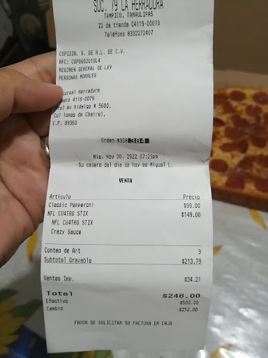 Read moreMuy mal servicio quedan, se compraron dos pizzas una de classic pepperoni y la otra cuatro stix y las dos eran de classic pepperoni y la sucursal de mi domicilio si estaba retirados y su única solucióny contestación fue que fue un error que solo sucedió cuando yo les pregunté si no estaban al pendiente de las pizzas que entregan como no se equivocaron dándome una de 3 carnes o una orilla rellena de queso. Muy mal servicio y la pizza era para festejar un cumpleaños y el festejado esperaba la que faltó...