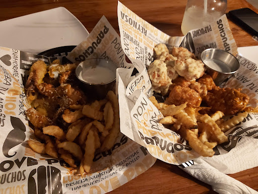 El lugar está muy nice, el servicio es ni muy lento ni muy rápido. El tamaño de las porciones está bien, aunque el sabor podría mejorar. Pedí banderillas, alitas y boneless con salsas búfalo hot, mango habanero, chipotle y parmesano ajo, la consistencia es muy gruesa y les falta sabor, sal o más especias, creo que pueden mejorarlas fácilmente. Otra cosita es que las órdenes que pedimos son de 10 piezas cada una y nos entregaron 9, le comentamos a la mesera y nos lo repusieron sin problema. El precio está bien, o sea está dentro de la media en este...