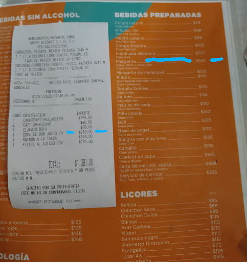 Read moreAGREGAN PRECIOS MAS CAROS AL FINAL El lugar es bonito, el día que fuimos había ruído ya que estaban soldando la entrada, el valet parking es optativo cuesta $40 pesos para llevarlo al estacionamiento del restaurante que está a dos calles, el mesero al principio fué amable al atendernos, la comida sabe bien, los precios comprados con otros lugares son un poco más caros, el mesero fue muy insistente en que pidiéramos una entrada o incluso que podía prepar una bebida enfrente de nosotros sin embargo le dijimos que no gracias, y al final al momento de pedir la cuenta notamos que en las bebidas NOS AGREGARON OTROS MONTOS MAS CAROS, el clamato en la carta vale $55 y solo tiene un tamaño, en la cuenta lo pusieron a $88, luego habíamos pedido una margarita que en la carta vale $125 y el mesero dijo que sería con tequila Don Julio, y en la cuenta pusieron una copa de Don Julio 70 en $218 , le pedimos una explicación al mesero a lo que el respondió algo sin sentido dijo que no nos dijo los precios porque no quería que nos ofendiaramos, entonces no es justo que engañen así a los clientes, la verdad no vamos a regresar y queremos...