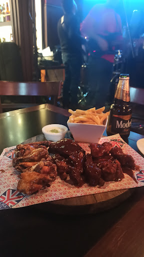 La decoración es agradable pero no hay congruencia entre lo inglés y lo que vemos en la decoración total. Encontré un casco de fútbol Americano tras la barra y las pantallas lo proyectaban. La iluminación me agradó y la decoración de botellas y accesorios como sombreros ingleses sobre las luminarias.