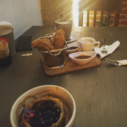 Desde la recepción me recibieron con una sonrisa enorme en el rostro. Fue de las meseras más atentas que hube conocido jamás. (En México) Por ahora mi opinión es sólo de la parte de la cafetería puesto que cuentan con dos secciones: Restaurante y cafetería. Siendo franco la selección era un poco pequeña, pero quizá prefiero eso a tener miles de "bebidas y postres" al grado que me agobia y no sé qué pedir. Hemos pedido un café americano, un frappé de chocofresa con leche normal, un cheesecake de frutos rojos y unos churros con chocolate. Personalmente yo pedí el cheesecake y el frappé pero también pude probar los churros. Estaba muy sorprendido de que el cheesecake fuera uno en miniatura, pero completo, no la típica rebanada. Parecía hecho ahí mismo y aunque me gusta más cuando entre ácido y dulce se inclina más a lo ácido, ¡FUE DELICIOSO! El frappé, lo mismo. Nada de atajos usando jarabes que terminan haciendo que todo sepa artificial, eran fresas de verdad y me parece que hasta una pequeña porción de mermelada al fondo, bastante refrescante. Por último, los churros, de buen tamaño y aunque dulces con un toque acidito en la masa que los hizo únicos, con ellos nos proveyeron de tres dulces para poder combinarlos: jarabe de chocolate, dulce D leche(cajeta) y una ración miniatura de leche con chocolate, ¡Quedé enormemente satisfecho!.