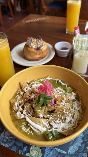 🍽️ Los chilaquiles verdes con pollo son un verdadero abrazo al paladar. Con una salsa de tono vivo y bien sazonada, el platillo llega coronado con cebolla encurtida, queso fresco y un toque de cilantro que realza cada elemento. Los totopos mantienen el equilibrio perfecto entre crujiente y suavidad, mientras el pollo añade proteína sin opacar el sabor principal. Recomendaría no saturar de salsa el plato.