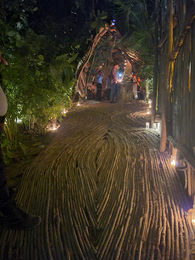 venue. Amazing. Jungle luxury boheme vibe. It just looks like what you would hope to find in Tulum. White sand dance floor. Dj stand with light show and effects. Long and large bar. Candle lighting.