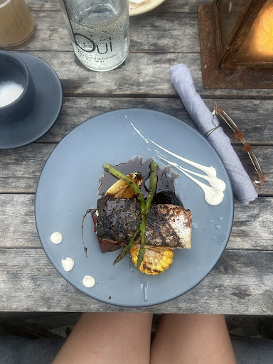 Upon learning that we were from a different hotel, the hostess immediately treated us like dirt, barely acknowledging us. After a few drops of rain outside, we were ushered into an indoor restaurant, where we were given the worst table, despite being the only diners (i.e., right next to a busy stairwell and ordering terminal, so incredibly crowded and hectic).