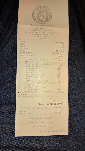 Read moreActualizado 04/08/2025: Ya elevó demasiado los precios de alimentos, bebidas y del billar... $150 la hora. El sabor de la comida no corresponde con sus precios. SE APROVECHAN DE QUE ES UNO DE LOS POCOS LUGARES DE LA CIUDAD PARA DIVERTIRSE. Sus precios altos generan que no vayamos tan seguido como antes... El mejor billar de la ciudad. Cuenta con restaurant y barra de bebidas. El área de mesas de billar es amplia y las mesas están en excelente estado. Puedes pedir alimentos y bebidas en el área de billar. Los alimentos es el punto débil. Las hamburguesas son malas. Los precios son accesibles. El lugar se encuentra en segundo piso. Se encuentra dentro de una plaza pequeña y usualmente es difícil encontrar lugar de estacionamiento adentro, por lo que hay que estacionarse afuera. Pusieron aire acondicionado, lo cuál urgía para hacer la estancia más agradable. Lugar...
